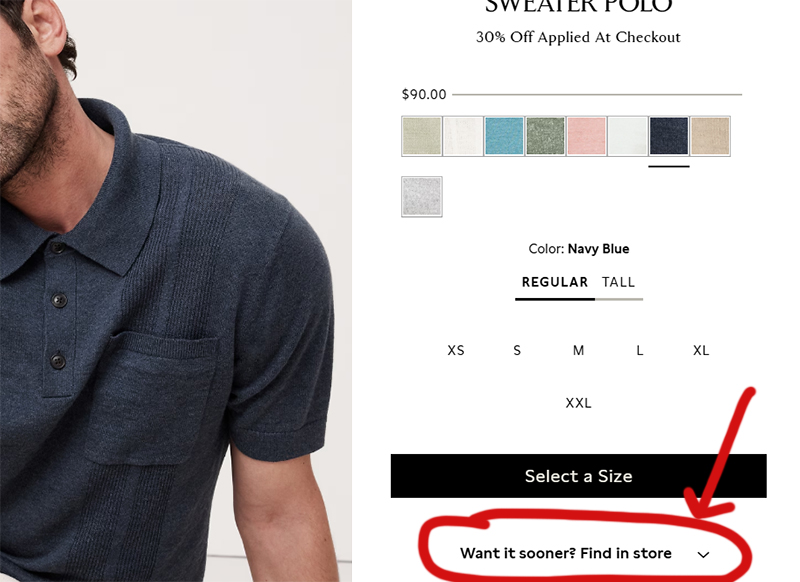 Lots of new warm weather arrivals to eye up. Notable exclusions are shoes, cashmere, and leather/suede apparel. Note: If you need something fast (say for a gathering this weekend), remember that BR has a “find in store” option on each product’s page. Just tap the little “Find in Store” drop down menu, hammer in your zip code, and they’ll dig through their inventory software to see if something is available nearby in your size.