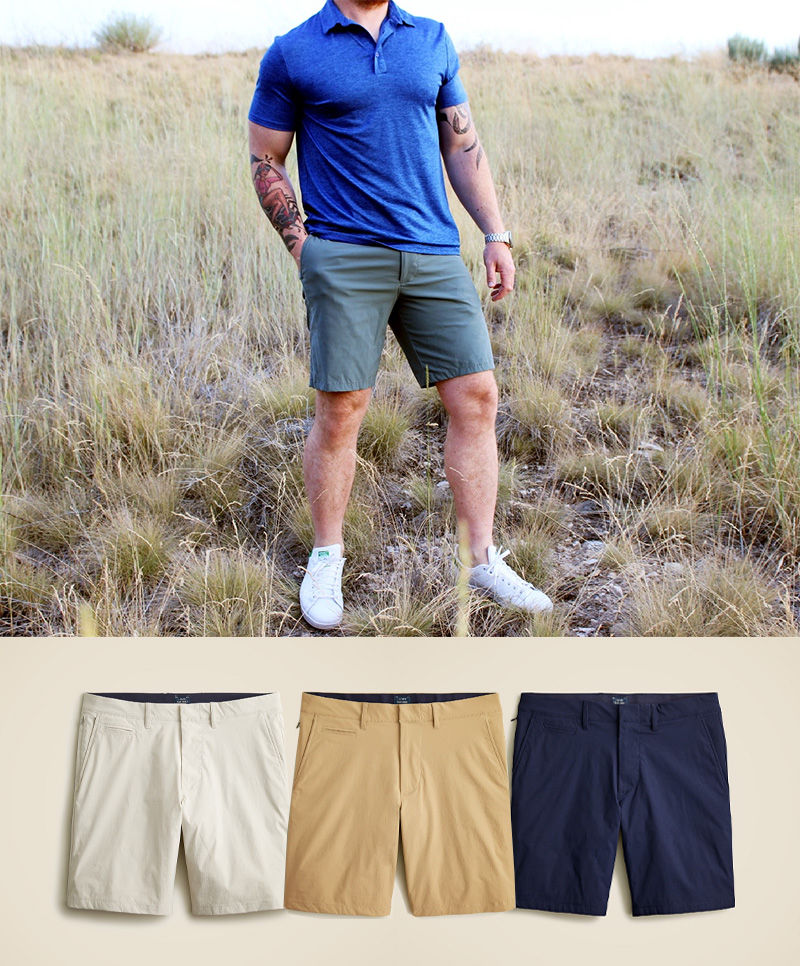 A favorite. No cotton in these. None. Pure performance fabric. They’re a blend of 57% recycled nylon, 39% polyamide, 4% elastane. Lots of stretch, and when it’s hot and sticky, they’ll help keep your pieces/parts from getting hot and sticky. Expect these to make some “swish swish” noise when walking. But the comfort is well worth that small drawback. They’re one of the best reviewed things on the J. Crew site. Size shown above is a 32, 9″ inseam, on 5’10″/185.