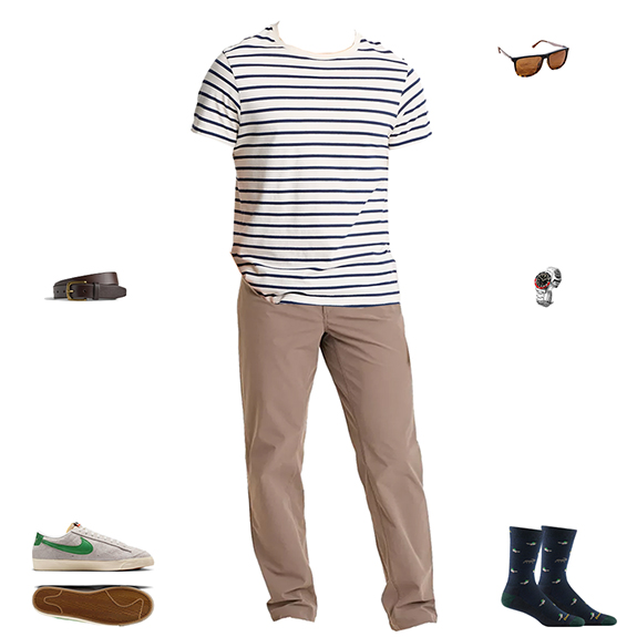 The T-Shirt: J. Crew Factory Slim Broken-in Striped Tee – $22.50. A classic. 100% cotton with Breton-style navy stripes.