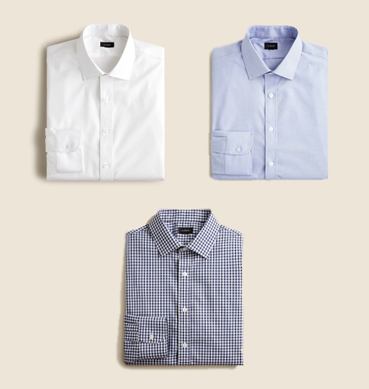 J. Crew’s flagship dress shirts. 98% cotton/2% stretch. White, light blue, or a navy gingham. Sold in alpha sizes (S, M, L, etc.) and not the more precise neck and sleeve measurements dress shirts are traditionally sold in.