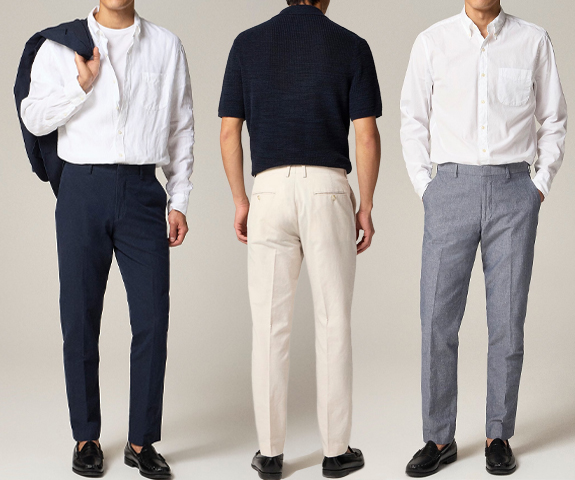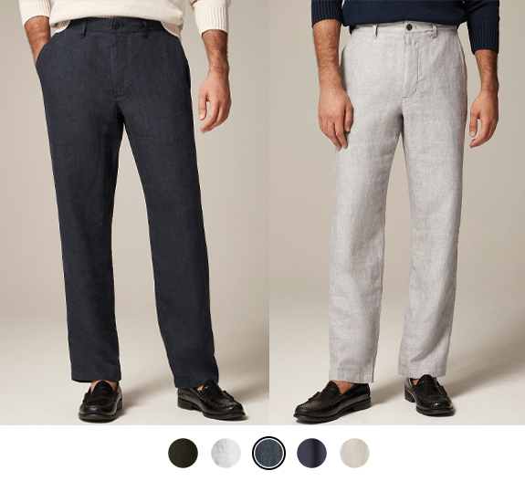 100% linen. Two inseam options. Three colors and an old-school-cool blue micro-houndstooth pattern.