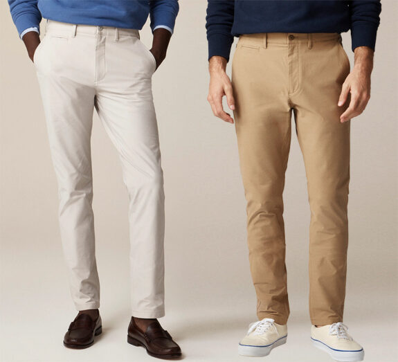 J. Crew’s tech pants are not fully synthetic. So if you’re someone who likes the feel of a traditional cotton fabrics but also want some performance blended in, these are worth a shot. 51% elastomultiester/41% cotton/8% elastane. Three fits. A few different basic colors to pick from.