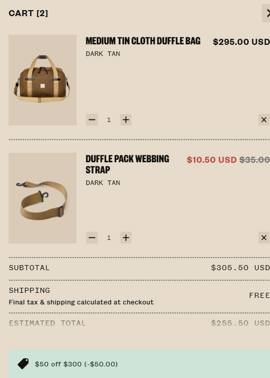 Filson: $50 off $300, $100 off $500, $175 off $750, $250 off $1000