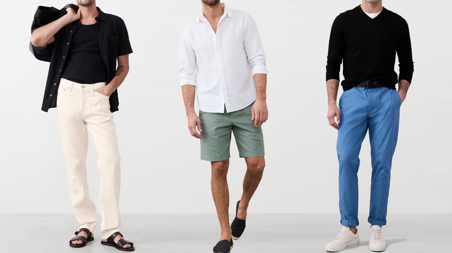 Shown at top: BR Factory: Summer-weight Jeans – $34.20, Shorts – $21.60, Summerweight Chinos – $35.70.