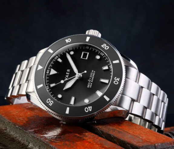 38mm or 42mm size. Solar powered quartz movement. Matte black bezel keeps the glare & gleam to a minimum. A highly capable, do anything watch that’s assembled in the USA for about half a grand. VAER is a brand that’s been on the rise the last few years, and the future for them seems bright.