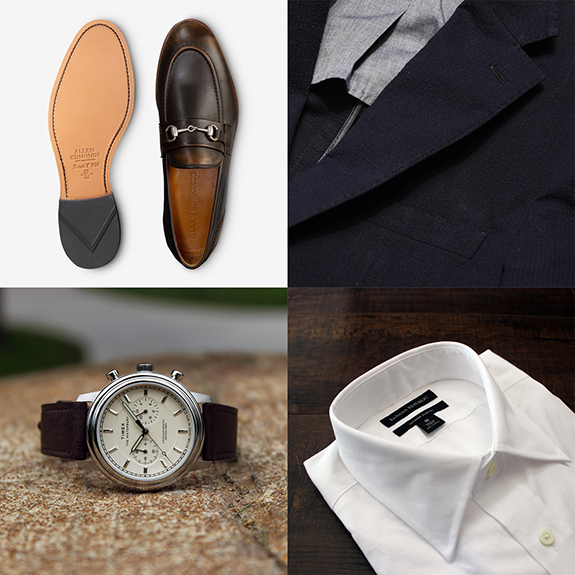 The Shoes: Allen Edmonds Randolph Bit Loafers in Hickory – $169.97 ($448): Fancy and a bit flashy, but the metal bit is brushed instead of polished. Crafted in Port Washington Wisconsin. Big thanks to Matt W. for the tip on these.