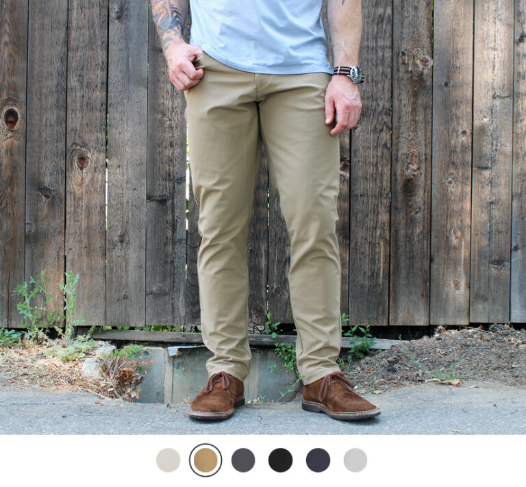 Full performance material. Not a cotton blend. They move great and feel great even in super hot weather. They’re the closest inexpensive alternative to lululemon’s ABC out there. But there are some key differences: There’s no gusseted undercarriage for ease of movement. The fabric feels just a touch lighter in weight (but not quite as lightweight as Target’s All in Motion golf pants). And they run a little longer in the legs than lululemon. Some may feel the need to flip up the cuffs or get them hemmed. There’s also no chino/trouser pocket layout option. Just 5-pocket styles (patch pockets on each cheek in the rear, scoops up front like a pair of Jeans). Here’s how a slim fit 32×32 looks on 5’10″/185, albeit in the (oddly) sold out khaki option.