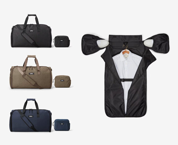 Summer means weddings. Often out of town weddings. Which means a lot of us have to get a sportcoat or a full suit from point A to point B and try to minimize wrinkling in-transit. These sold-by-bespoke-post “Halfday” garment Duffels are one of those designs which unzips flat into a garment bag, and then you gently roll your suit/sportcoat up (around other stuff you’ve packed) and you’re on your way. Upon arrival, immediately hang up your suit (in a bathroom where steam from a shower can help release wrinkles picked up while traveling) and fingers crossed you’re good to go. On sale and they’re even including a toiletry kit.