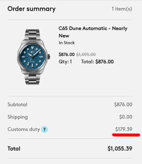 Happens only twice a year and these watches usually move very fast. These ship from the U.K. Which means if your order is over $800 you’ll get hit with import duties/fees/tariffs at checkout. And that can be steep (example here.) Sales taxes are refunded if you return your watch, but the duty value is not.
