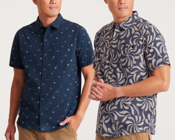 100% organic cotton, a few different fun patterns, and old-school wood-like lookin’ buttons for vintage vacation shirt style.
