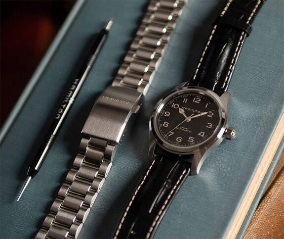 Finally, the big brother Murph gets a factory stock stainless steel bracelet. The 38mm version of Hamilton’s perfect GADA watch has had an available stainless steel bracelet for awhile, but up until now the (original) 42mm version has been stuck on its leather strap. With this new bundle package you get both the leather strap and a stainless steel 3-link option. Comes with a spring-bar tool. Ideally drilled lugs would be standard or even quick release pins on the bracelet & strap, but apparently that was a bridge too far. So far.