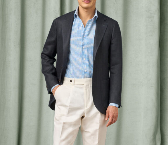 You want an airy, breathable, summery sportcoat? There it be. 100% linen in an airflow encouraging hopsack weave. Just 1/4 butterfly lined in the back. Half canvas, unpadded shoulders, patch hip pockets.