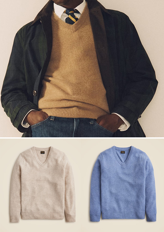 Key word: Relaxed (fit). Which is on-trend but still not everyone’s cup of tea. 100% cashmere. Three colors. Camel is the lower priced option, with the other two being the higher priced.
