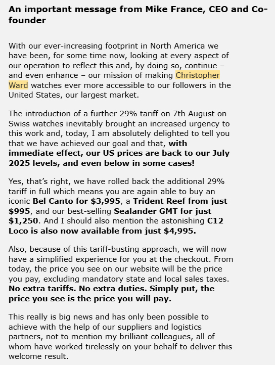 Of all consumer goods, Swiss watches have been some of the hardest hit by tariffs. But thanks to bulk importing their watches (instead of shipping direct to their customers where the tariff would be calculated by the full MSRP), Christoper Ward has been able to roll back the additional 29% tariff implemented when the original 90 day pause expired. There are still tariffs, but the price you see is the price you pay (excluding any mandatory local and state sales tax). No more extra charges at checkout, and the prices are back to where they were in July, if not lower. It’s called Tariff Engineering, and it’s absolutely a thing.