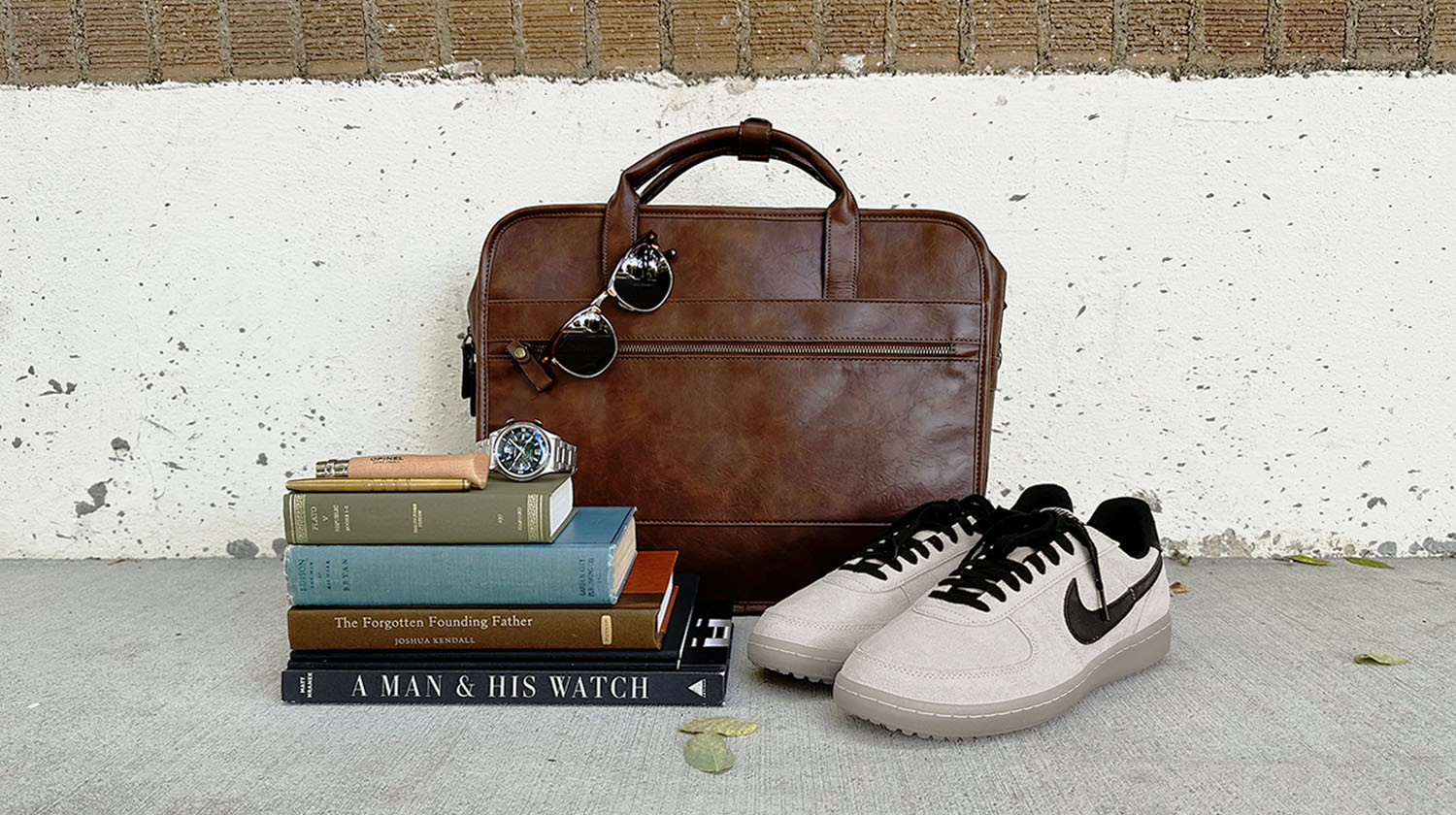 Above: Leather Briefcase via Amazon – $58.99, Kent Wang Sunglasses – $55, Nike Field General – $105, Nodus Duality Automatic Watch – $800