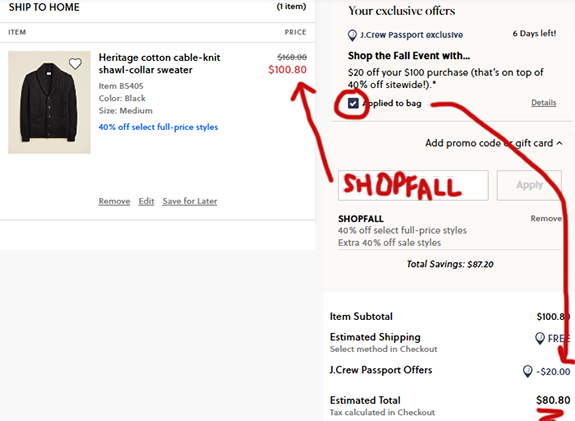 Got that? Sweater is $168. Apply the 40% off code SHOPFALL. Make sure you’re logged into your account and then check the $20 off $100 offer at checkout. Final total = $80.80. Which is more than half off.