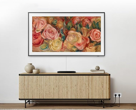 Dolby Atmos, Anti-Reflection, etc. It’s pretty great at blending in and the matte-screen is awesome, but some have reported scattered problems with the software being sluggish and finicky. Also, if you’re a real video/audiophile, there are probably better setups out there. But in terms of interior design, that looks pretty darn great. Review from The Wirecutter can be found here.