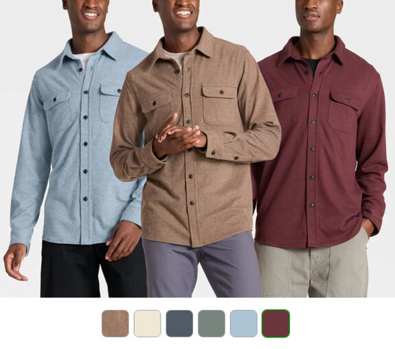 Like J. Crew’s knit “seaboard” shirts, only these cost less. Knit instead of woven, so more flex and some squish. Note that J. Crew’s seaboard shirts are a cotton poly blend, whereas Target’s cheaper version of this style are a poly/rayon/spandex mix.
