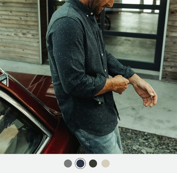 A basic button down which isn’t boring. Donegal flecks. Overbuilt with details like reinforced elbow patches and a bi-swing construction in the back for additional shoulder movement. Four colors. Shown at the very top of the post in “Natural.”