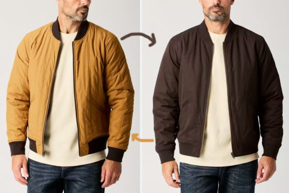 It’s two, two, TWO jackets in one. Colors are “Maple Brown” & “Black Coffee.” Which is far better marketing than using digestive-tract related descriptors. “This is my jacket. Some days I wear the #1 side out. Other days, #2. Life doesn’t have to be boring.”