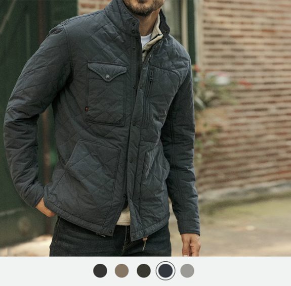 Four colors. The brilliant midpoint between a waxed jacket and a quilted jacket. Gray, Dark Navy, Olive, or Brown.