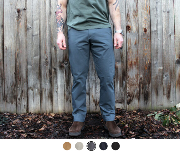 Of of their bestsellers. They’re comfortable. They move well. Hidden side seam zip pocket. Interior gel gripper waistband detail to help keep shirts tucked. Clean, snap front closure. Performance + cotton blend fabric. Not full performance. Which many prefer, as it avoids the sometimes but not always “plasticky” look of some full performance fabric pants.
