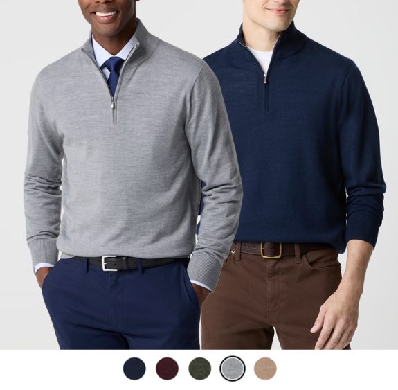 #1. J. Crew Factory Merino wool-blend quarter-zips – $28.79 FINAL ($50ish)