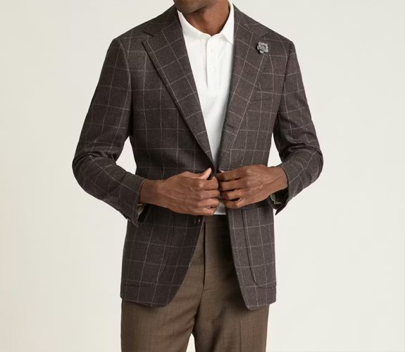 Recently restocked in a few common sizes for the windowpane pattern shown above. Not cheap, nor should it be. 90% Virgin Wool, 8% Cashmere, 2% Elastane from Italy’s Tollegno mill. Ships/returns for free.