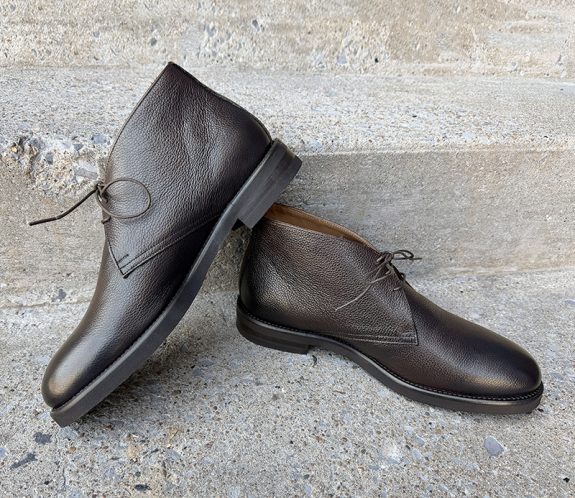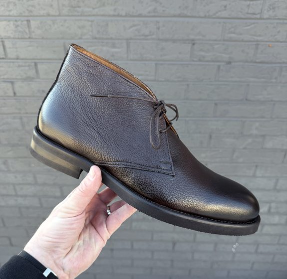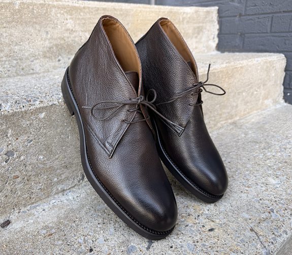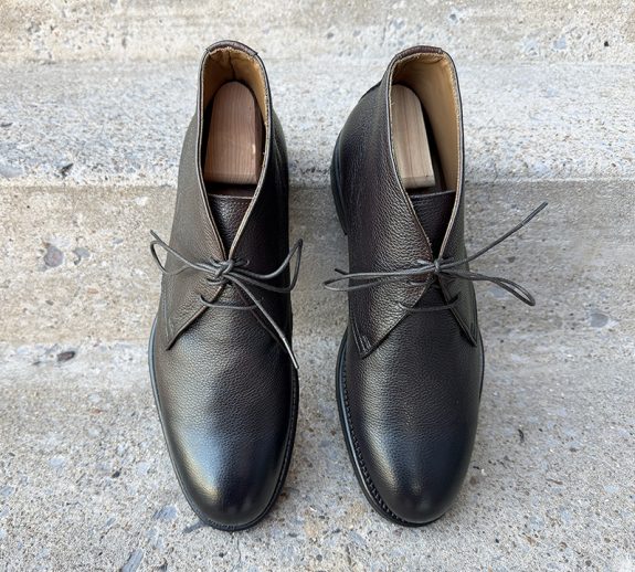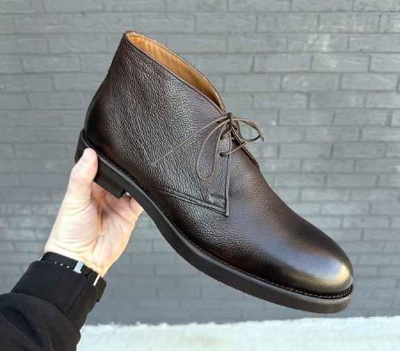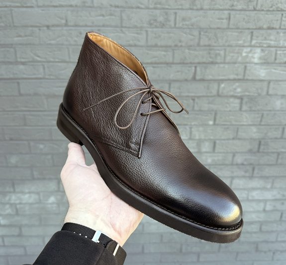 Fresh out of the box, these chukka boots look considerably more expensive than their price tag would suggest. The Italian calfskin leather has a scotch grain or pebbled texture imprinted onto the upper, which is a fantastic design choice, as it adds visual interest and disguises minor scuffs and wear in a way that smooth calf leather simply cannot. The burnished finish at the toe and heel gives the boot a genuine sense of depth; the color shifts between a rich dark espresso brown and near-black depending on the light and angle, which lends a dressy, almost bespoke quality to the silhouette from a distance. The three-eyelet design is clean and well-proportioned. In my opinion, this design doesn’t lean too American or too European.