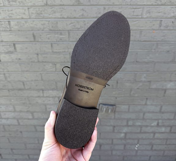 The Saluzzo chukka rides on a Nordstrom-branded SGM LIVETECH molded outsole unit, constructed from a blend of EVA, TPU, and PVC. On paper, that combination delivers a lightweight and shock-absorbing platform. Out of the box, the outsole does feel noticeably lightweight, springy, and cushioned underfoot, more so than a traditional leather or dense rubber sole. For someone on their feet for long stretches, that initial comfort could be a genuine selling point. The concern, as with most composite outsole constructions of this type, is longevity. EVA in particular is prone to compression set over time, meaning it loses its bounce and cushioning properties with extended wear. For you, that means the outsole that feels great on day one may feel considerably flatter and less supportive a year down the road. The outsole profile is low and relatively sleek, which suits the boot’s overall aesthetic, but don’t expect it to handle heavy outdoor use or particularly wet conditions gracefully. This is a dry pavement boot, and its sole is built accordingly.
