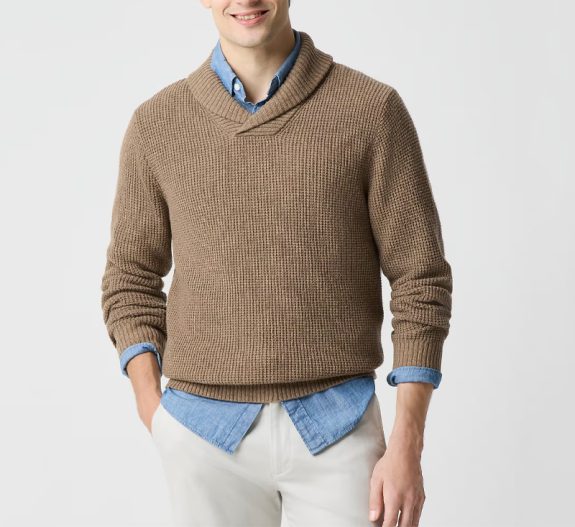 Waffle-stitch shawl-collar sweaters – $35.39 FINAL ($117.99)